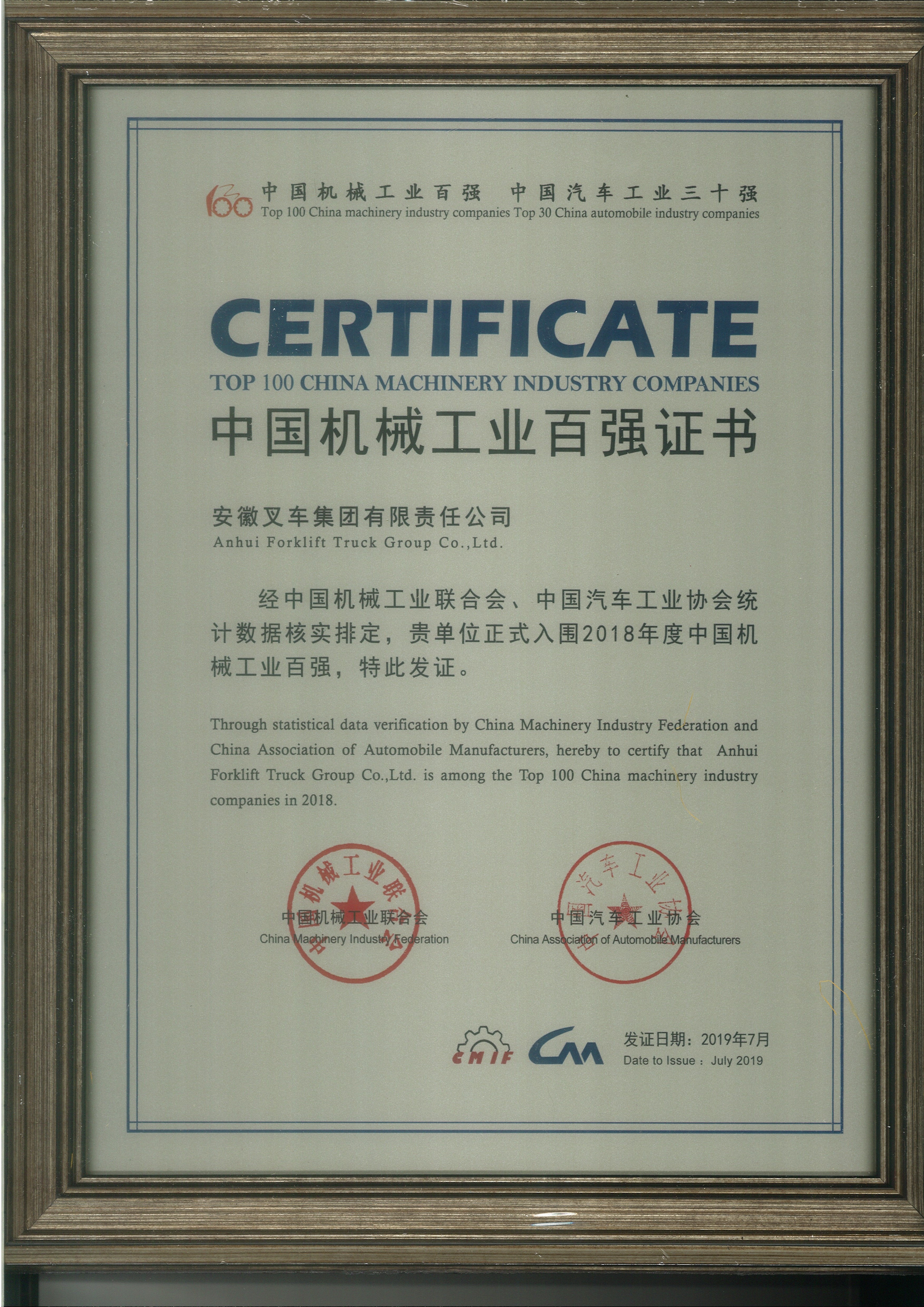 2020 中國機械工業(yè)百強證書
